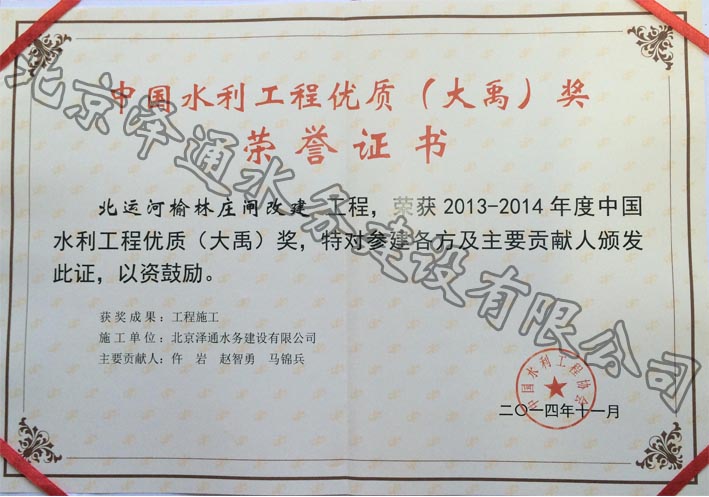 2013-2014年度中國水利工程優(yōu)質(zhì)(大禹)獎榮譽(yù)證書